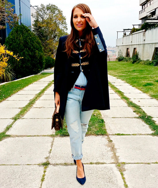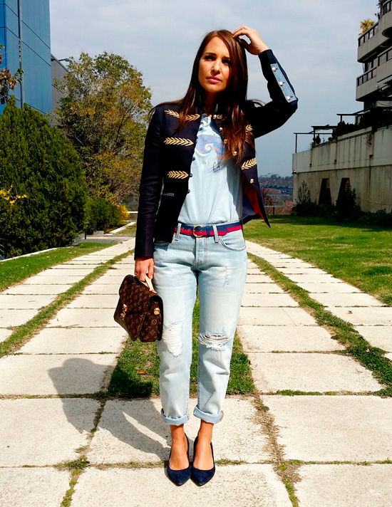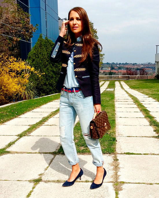 Si mezclas ambas en un mismo combo, tendrás un combo perfecto, sencillo, elegante y básico. La protagonista de Velvet ha apostado por una chaqueta muy especial con apliques en tejido vaquero y bordados en dorado. Para aderezarla, nada como una camiseta de Dolores Promesas en azul bebé.
