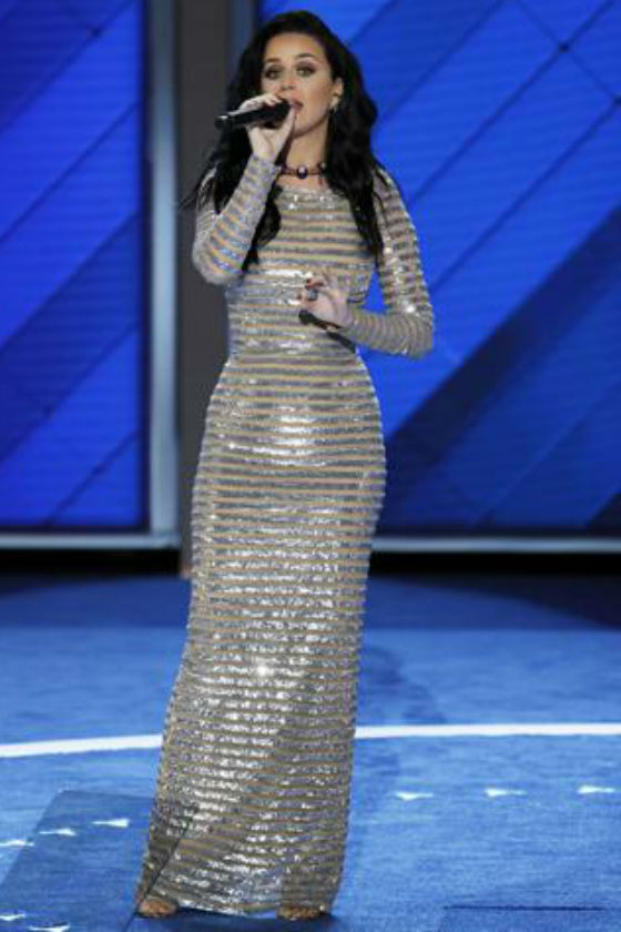 Y…Katy Perry tampoco se queda atrás luciendo un vestido de corte similar también en metalizado color plata pero con un motivo de rayas.