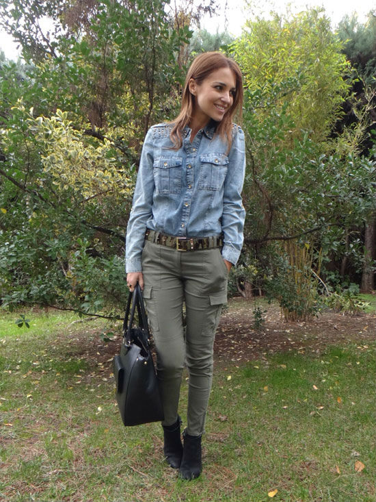 El toque denim de este combo resta seriedad a un outfit compuesto por pantalones cargo y camisa vaquera, combinados con bolso y botines en negro.