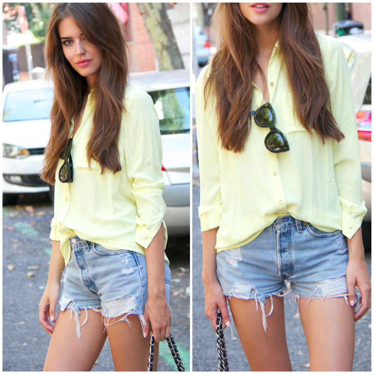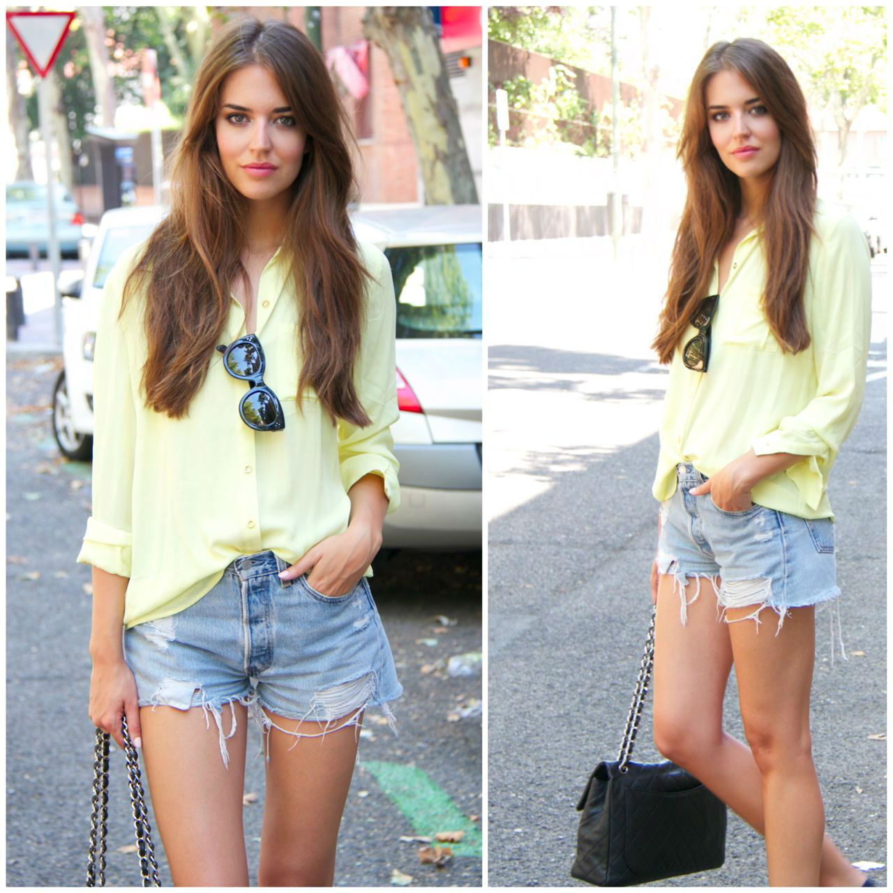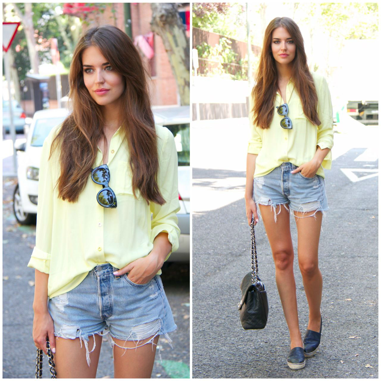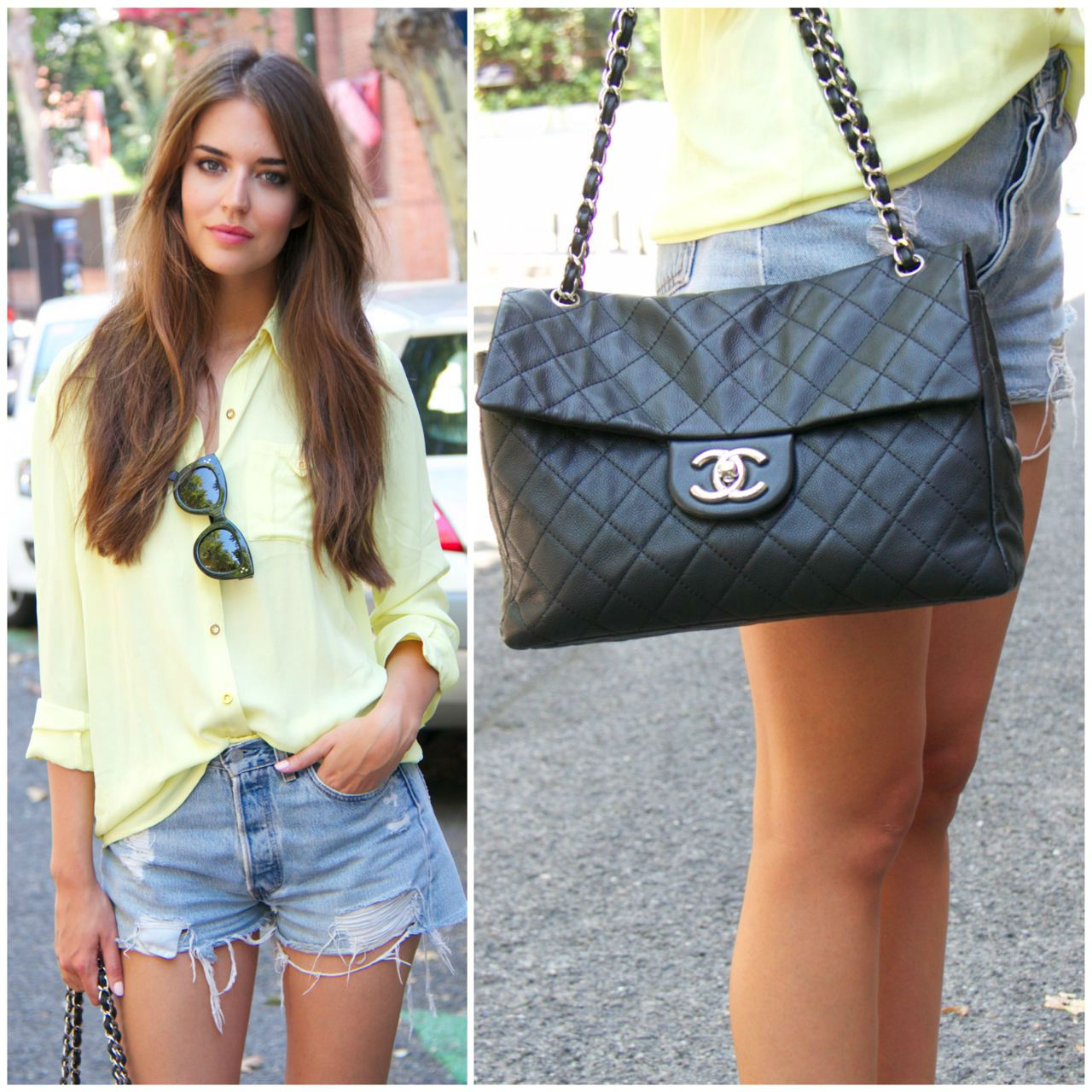 En su último look la modelo apostó por un conjunto muy simple pero estiloso compuesto por una camisa amarilla de Forever 21, shorts desgastados de Levi’s y las famosas espardeñas de la firma Chanel. El bolso, al igual que el calzado, es de la misma marca y es que como ella misma revela ,“ este bolso es el primer bolso de marca que me compré. Tiene ya unos cuantos años y muchos kilómetros encima, pero se conserva igual o mejor que el primer día.»