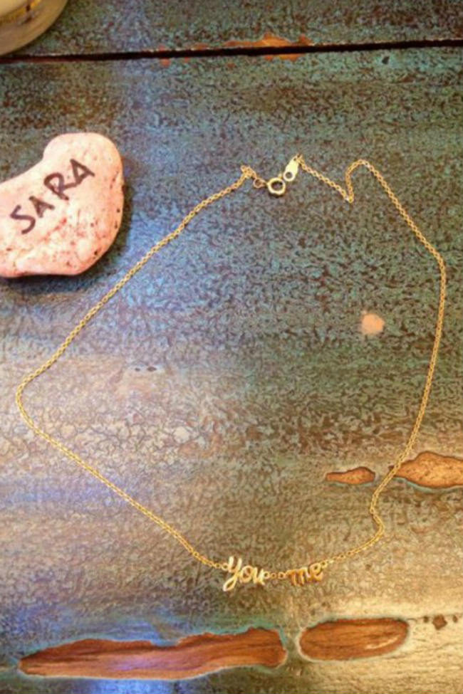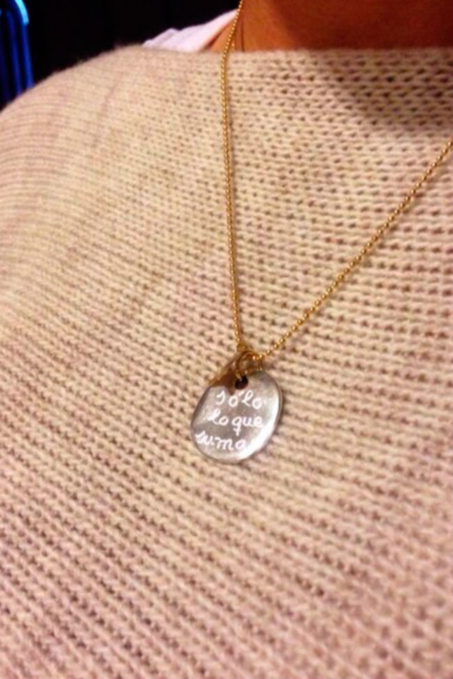 Cada colgante es único ya que puedes personalizarlo grabando la frase que quieras. En el de Sara pone “Sólo lo que suma”, una frase que le encanta y que usa mucho.