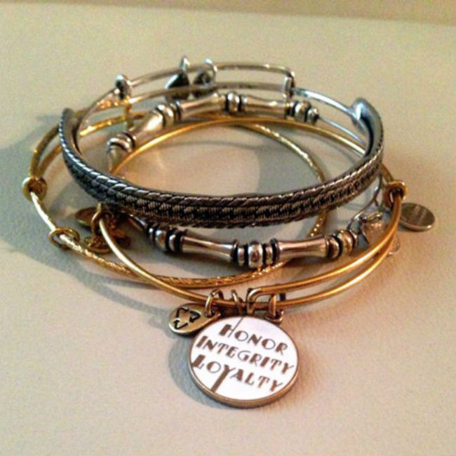 Por último, las pulseras de “Alex and Ani” tampoco faltan en el joyero de Sara. Son rígidas con diferentes motivos y chapas: iniciales, símbolos, signos del zodiaco, santos, piedras,…