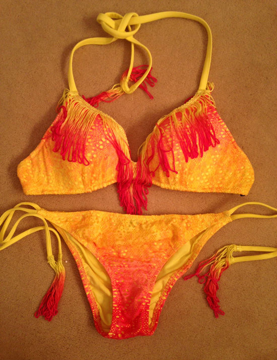 Bikini de encaje con flecos en naranja y amarillo degradé