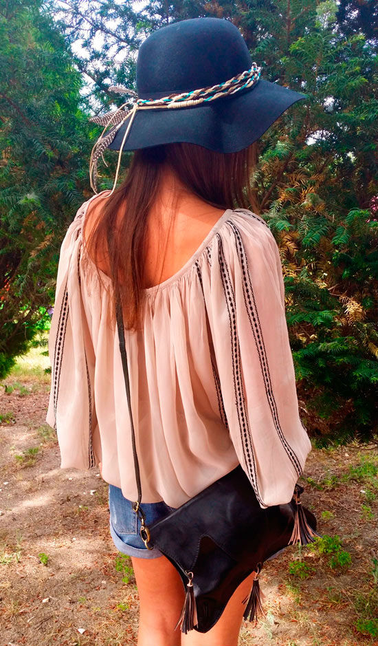 Este estilismo nos tiene enamorados por su aire boho y el detalle de plumas de este precioso sombrero fedora.
