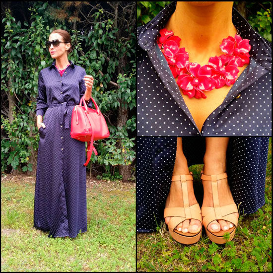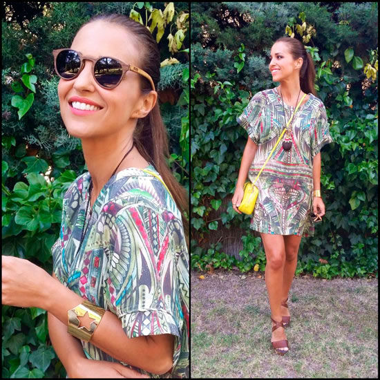 Su amplia colección de gafas de sol es la envidia de muchas. Estas de madera son muy cool y forman un combo especial con el vestido.