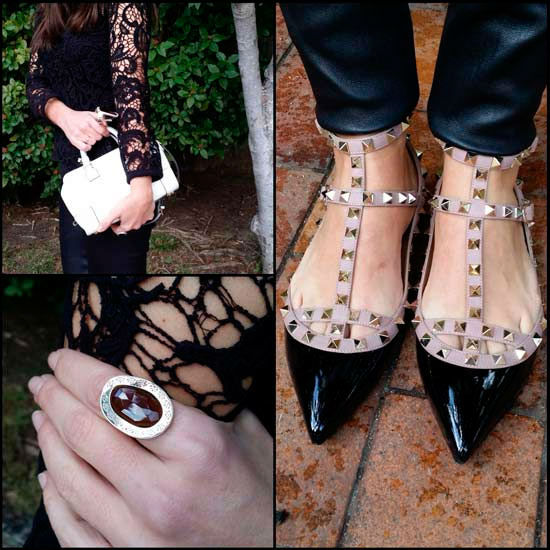 Las archi conocidas sabrinas con tachuelas de Valentino destacan a la perfección con la blusa calada en negro.