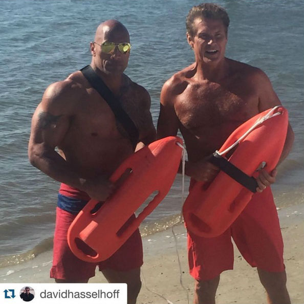 Los rumores (y esta fotografía) apuntan a que David Hasselfhoff, protagonista en la serie, hará un cameo en la versión adaptada al cine. En la fotografía vemos al actor junto a Dwayne The Rock Johnson, encargado de protagonizar el papel de Hasselholff.