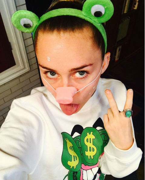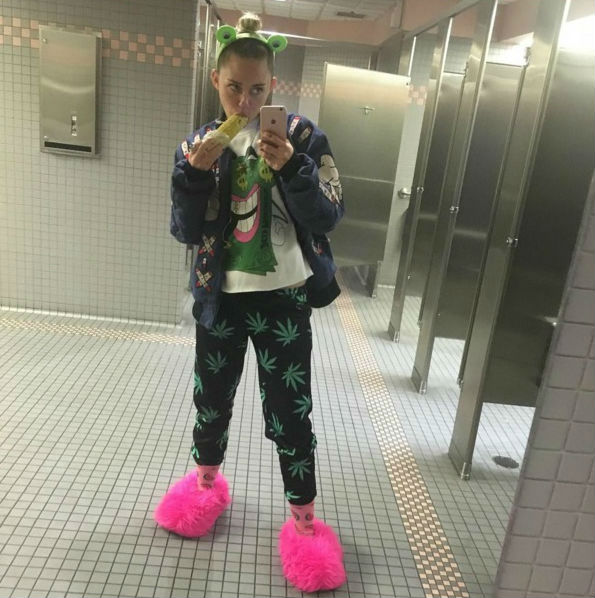 Cyrus ya ha colgado varias imágenes luciéndola en su cuenta oficial de Instagram. Aunque el look va muy en la línea a lo que últimamente nos tiene acostumbrados, no hay por donde cogerlo. Zapatillas de estar con pelo fucsia, calcetines rosas estampados, pantalones con hojas de marihuana, chaqueta con parches, una diadema con ojos de rana y la sudadera en cuestión. Vamos, que parece que acaba de salir de la cama pero en una versión rocambolesca.