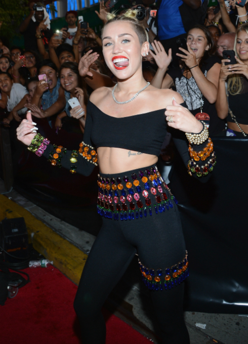 La inocente Hannah Montana de Disney ha pasado a ser una rebelde Miley Cyrus que solo busca llamar la atención. Apareció sobre la alfombra roja con un diseño vintage compuesto por leggings y top crop de Dolce & Gabanna decorado con piedras de colores. La actriz acompaño el look con unas sandalias de plataforma color negro de Giuseppe Zanotti.