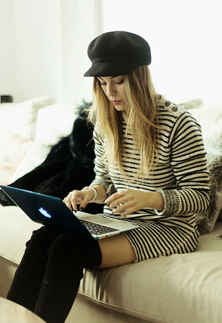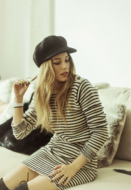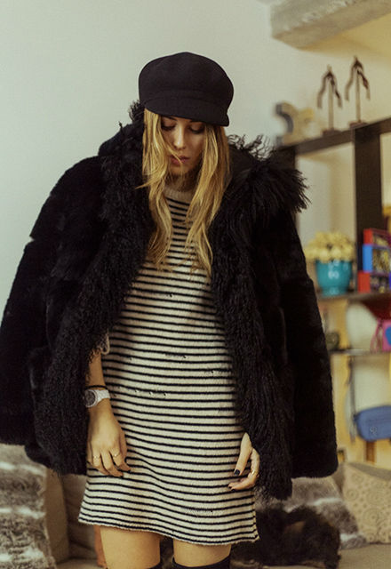 Botas negras de Stuart Weitzman Abrigo “peludo” negro de Maje / Abrigo negro de Maje / Vestido de rayas de Zadig&Voltaire / Gorra de Kling