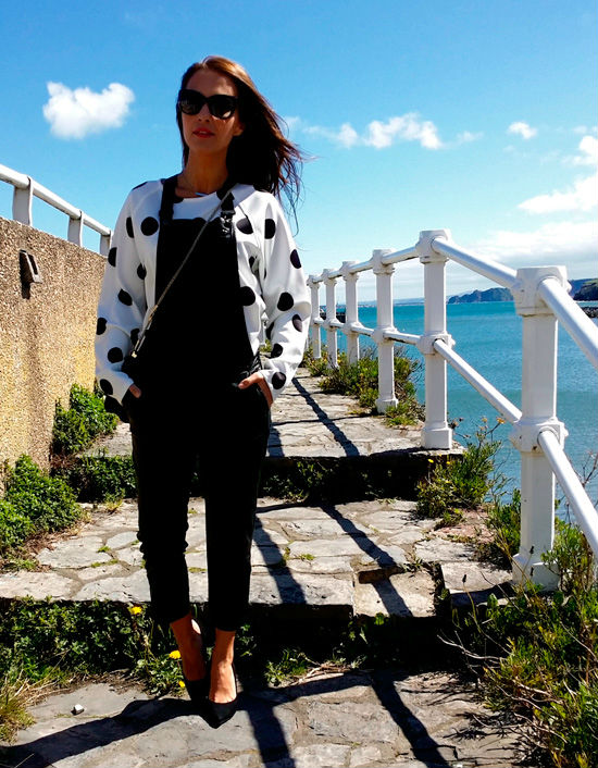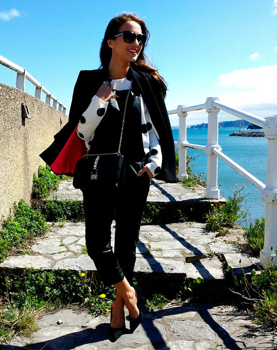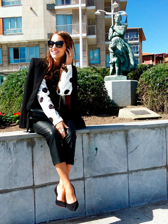 La asturiana prefiere combinar su peto negro de polipiel (otro de los must have que no puede faltar en tu armario) con una sudadera de polka dots en versión XL. Los zapatos de tacón y la blazer aportan ese toque chic y sofisticado que crea un contraste único y perfecto.