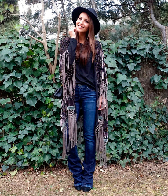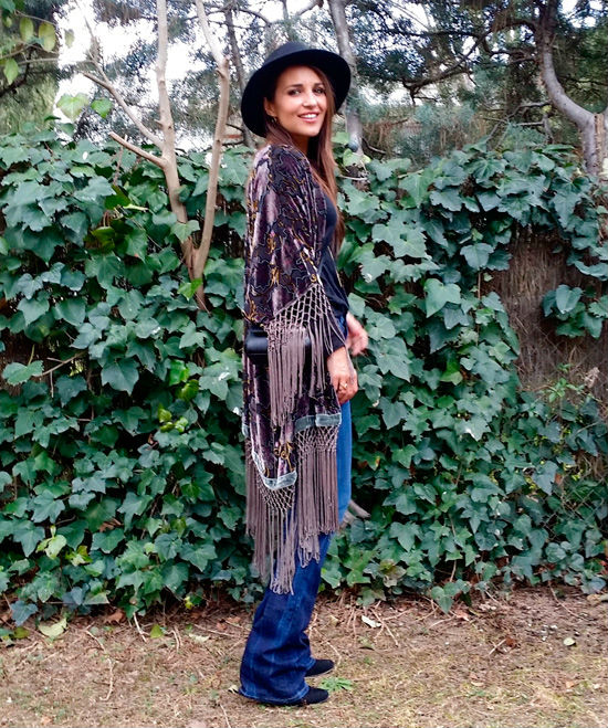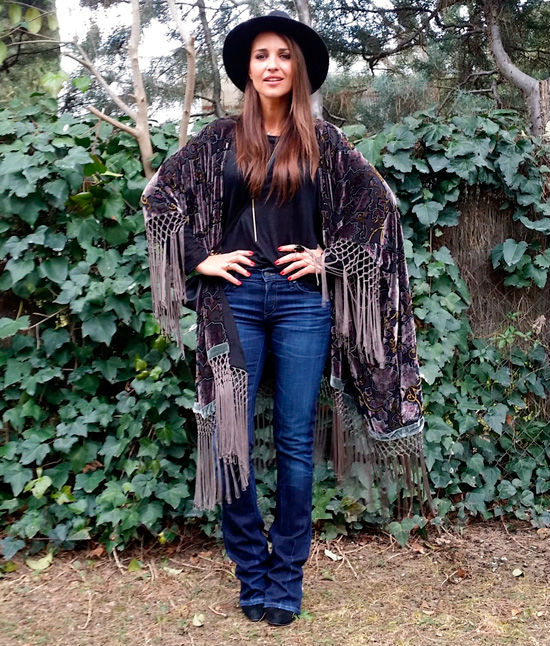 En su look de hoy, la protagonista de Velvet ha optado por una de las prendas que más ha acaparado los armarios y miradas, el kimono. El modelo de Paula Echevarría se caracteriza por el largo, los flecos y por el print de flores en relieve gracias al terciopelo.