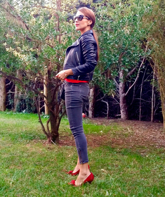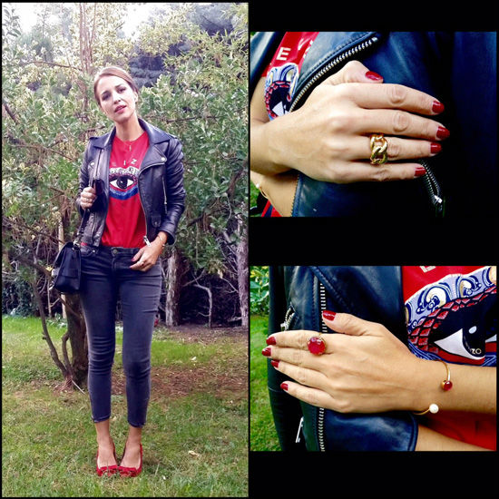 La mujer de David Bustamante luce como una ‘Rock Star’ con jeans y cazadora de cuero de MANGO, camiseta de KENZO, zapatos de ÚRSULA MASCARÓ, bolso de PROENZA SCHOULER, complementos de TOUS y gafas de sol de FENDI.
