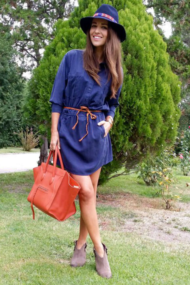 Este conjunto que luce la protagonista de Velvet es uno de nuestros preferidos por su sencillez y esencia hippie-chic. Es increíble cómo un sencillo vestido en tono azul marino puede transformarse en una prenda tan especial añadiendo los complementos adecuados. Paula Echevarría complementa este diseño camisero con un bolso de mano en clave XL y unos botines camperos.