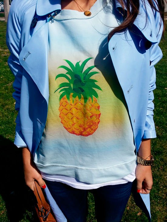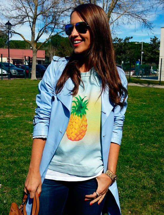 La actriz de Velvet apuesta por él en una versión de lo más característica, su color es la guinda de un estilismo plagado de alegría y optimismo. Para aderezarlo, ha optado por una divertida sudadera con print de piña, un estampado que esta temporada abarrota muchos de los artículos que ocupan esta temporada.