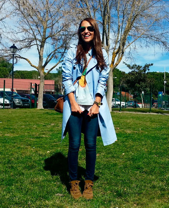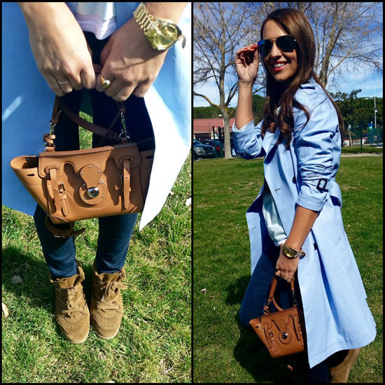 LLeva jeans de DIESEL, sudadera de COOL THE SACK, trench de piel de GERARD DAREL, sneakers de ISABEL MARANT, bolso de RALPH LAUREN, gafas de MISS HAMPTONS, reloj de TOUS, collar de MARAMZ, pulsera de KORDS y anillo mini de 2ENESPIRAL.