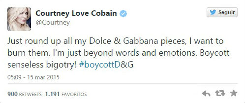 “Voy a amontonar todas mis prendas Dolce & Gabbana, quiero quemarlas. No tengo palabras. ¡Boicot al fanatismo sin sentido!”, dice Courtney Love.