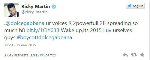 Ricky Martin también quiso pronunciarse: “Dolce & Gabbana, vuestras voces son demasiado poderosas como para estar propagando ese odio. Despertad, estamos en 2015. Amaos a vosotros mismos, tíos”.