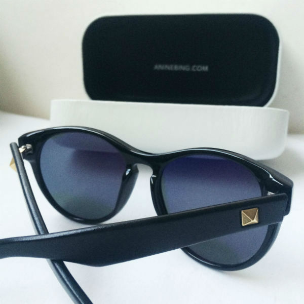 Gafas de sol negras polarizadas con tachuela dorada y patilla de cuero de @carolvoga.