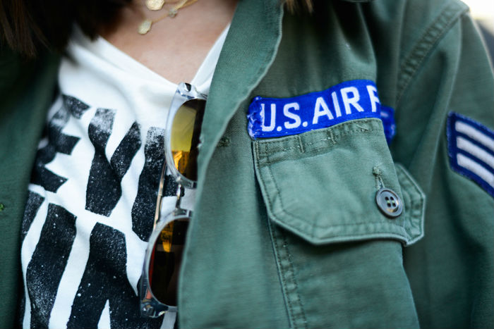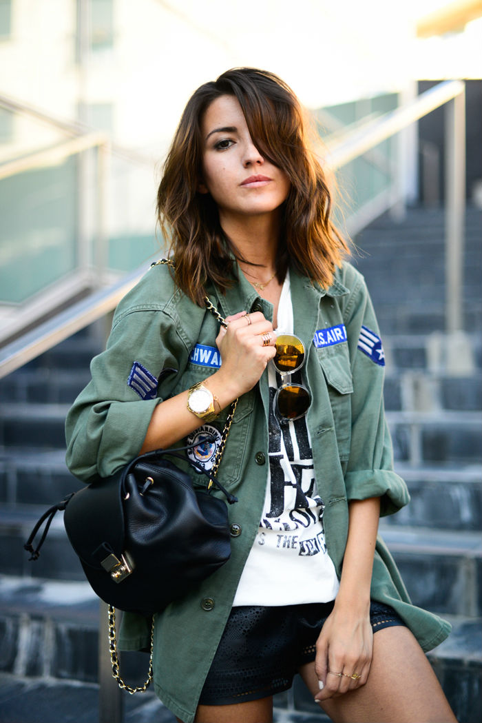Los parches de la camisa militar aportan un punto desaliñado al un look cuidado hasta el último detalle.