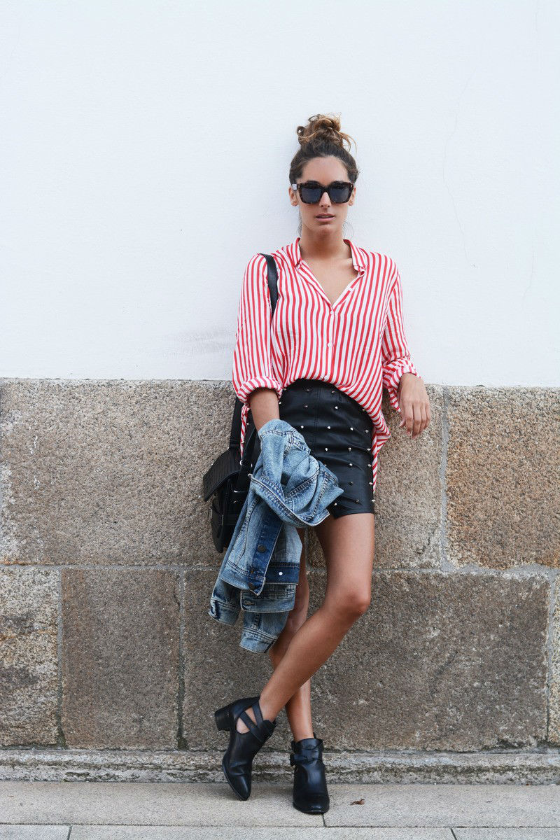 En el primer outfit la blogger combina su camisa con una falda de efecto cuero con aplicaciones metálicas, chaqueta vaquera y botines negros con aberturas.