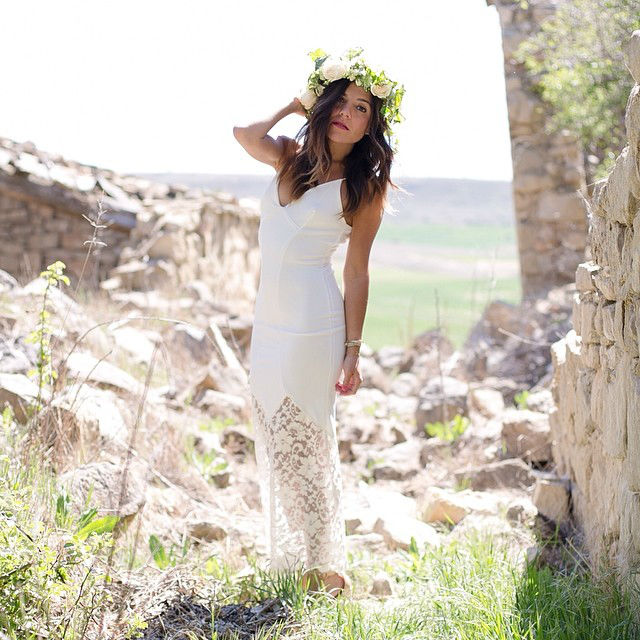La blogger Paula Ordovás lleva un precioso vestido blanco de tirantes con el bajo de encaje. La corona de flores termina de rematar un look perfecto.