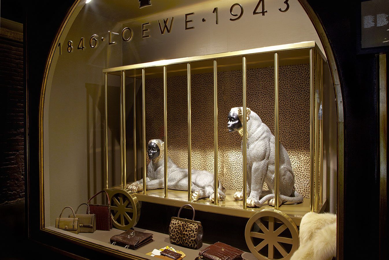 A partir de aquí, las escaleras ascienden a una entreplanta superior, donde se expondrá una selección de las piezas de archivo de Loewe. Este viaje al pasado incluye una reconstrucción de un escaparate de Loewe de la década de 1960.