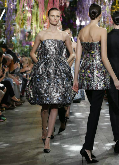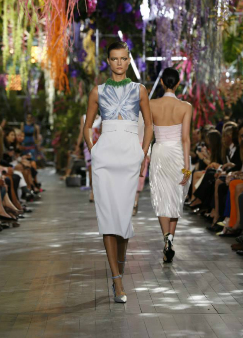 El techo del Museo Rodin simulaba un bosque encantado para mostrar las propuestas más atrevidas para la primavera verano 2014. El diseñador creativo de la firma, Raf Simons, propone diseños sofisticados en faldas plisadas y vestidos camiseros.