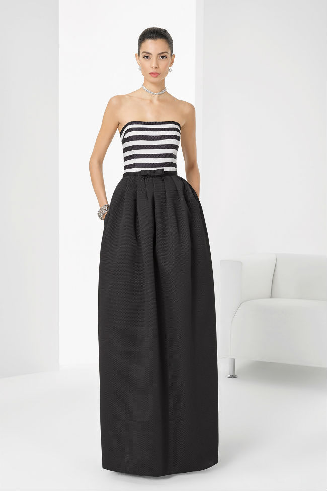 Vestido de piqué a rayas. Las faldas largas y pomposas, claramente te hacen sentirte una princesa y este vestido con escote palabra de honor a rayas negro y blanco, con la falda desde la cintura negra adornada con un pequeño lazo a modo de cinturón no va a ser menos. Simplemente con la elegancia del corte y el negro triunfarás.