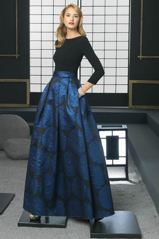 Vestido de brocado y crepé. Si eres de las que les gusta ir un poco más diferente este conjunto innova más, ya que complementa la falda larga en estampado brocado con la sencillez de un top de manga francesa con escote en la espalda en color negro, y juntos hacen la conjunción perfecta.