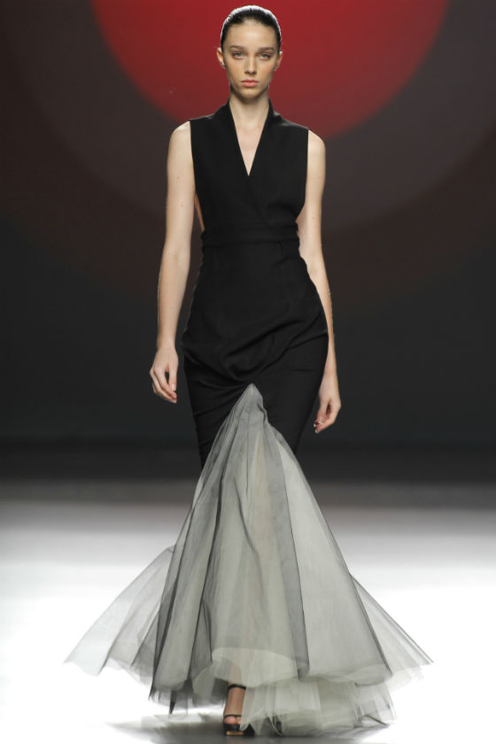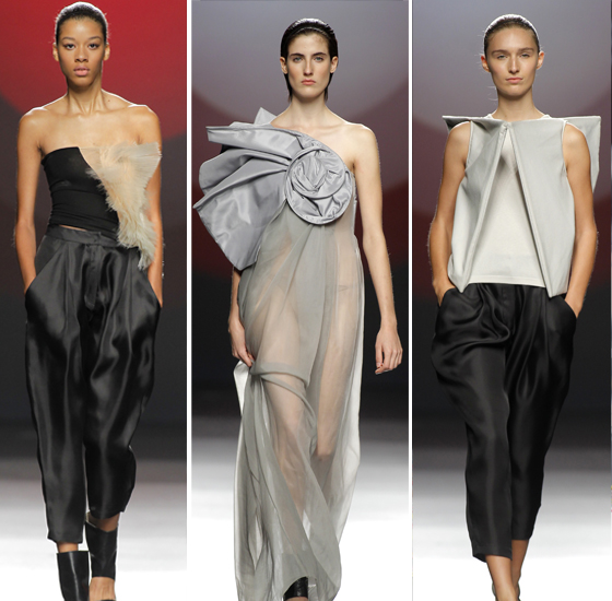 Arzuaga opta por los volúmenes con movimiento, un efecto que ha conseguido a través de combinaciones exactas entre tejidos y cortes. No es la primera que emplea este tipo de diseño, ya que la modista renueva sus anteriores colecciones para dar lugar a unas propuestas tan originales como artísticas. La moda tridimensional ha llegado a la pasarela madrileña con vestidos largos y cortos, una forma de rendir culto a la elegancia más femenina.