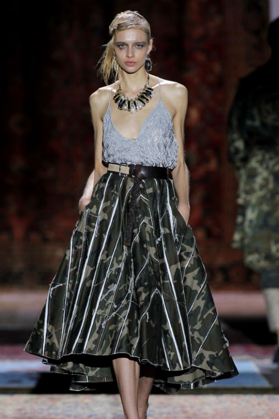 El estampado de camuflaje es uno de los grandes must have de esta colección. Amplias faldas de talle alto, diseños de tubo o bodies con volantes se convierten en el mejor aliado de la estética army para la temporada primavera verano 2017.