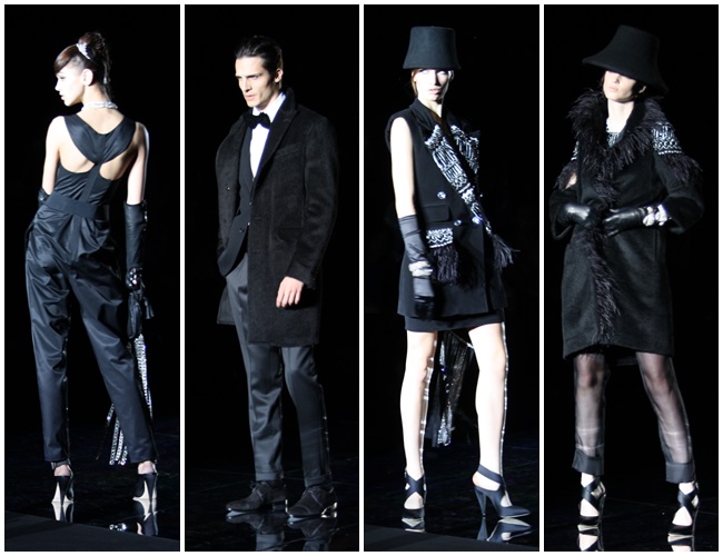 La noche se envuelve de negro y diamantes para mostrar en todo su esplendor los vestidos con capa, los monos/pantalón y los envolventes plumíferos.