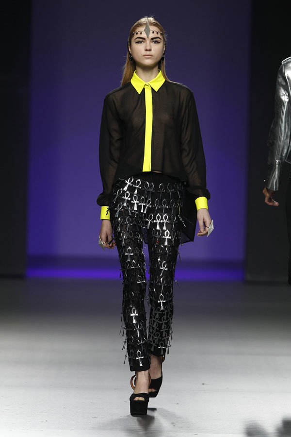 El negro como color base se utiliza para las prendas de color y las aplicaciones plateadas con forma de cruz egipcia, decorando faldas, hombros y dibujando baberos sobre jerséis con una estética nu rave.