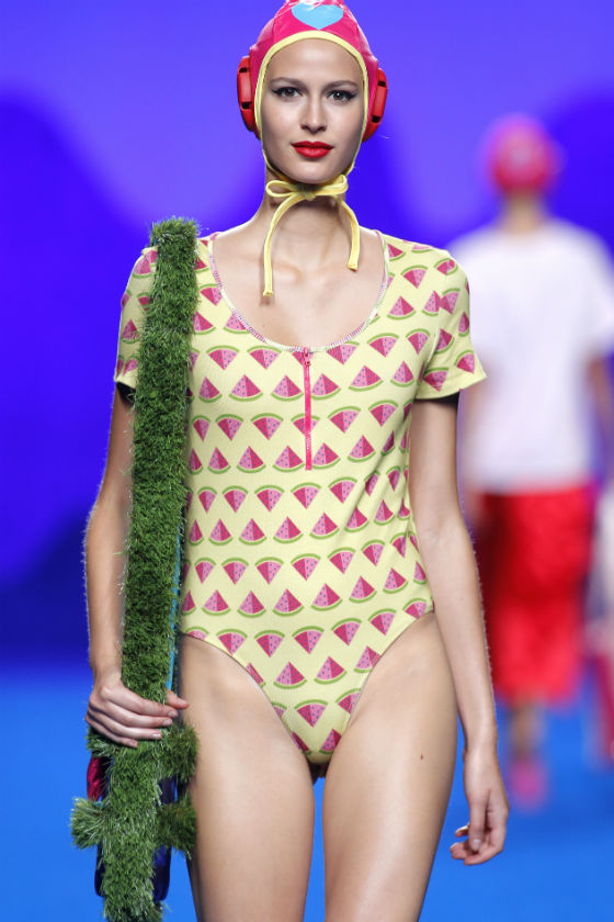 Siempre tan original y colorista, Ágatha Ruiz de la Prada volvió a demostrar que su visión de la moda no tiene horizontes. La diseñadora creó para este 64º edición de MBFWM unos divertidos bolsos elaborados en césped artificial con bordados de flores en lentejuelas. Aunque no fueron el único accesorio que no pasó desapercibido, todas las modelos llevaron un gorro de natación con el icónico corazón agathista.