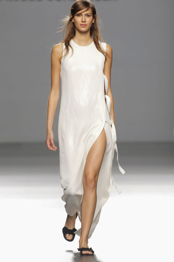 Para Angel Schlesser la sobriedad más elegante se consigue sin complementos. El modisto quiso que las prendas fueran las verdaderas protagonistas, empleando únicamente unas sandalias de pala con lazo en la parte frontal.