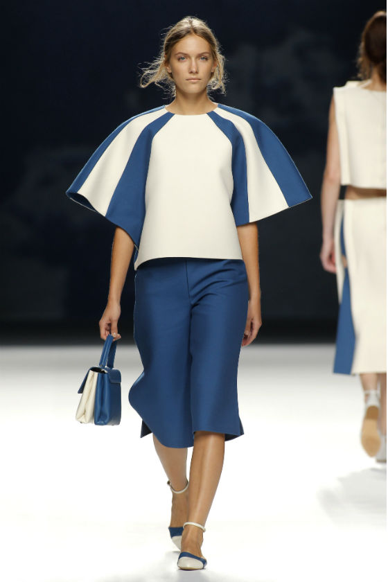Devota & Lomba tomó, como principal fuente de inspiración, la técnica del origami. La mezcla de colores que utilizó tanto en prendas como en complementos fue la formada por el azul marino y arena crean, un mix que podemos apreciar a la perfección en sus sabrinas de punta y bolsos de mano.