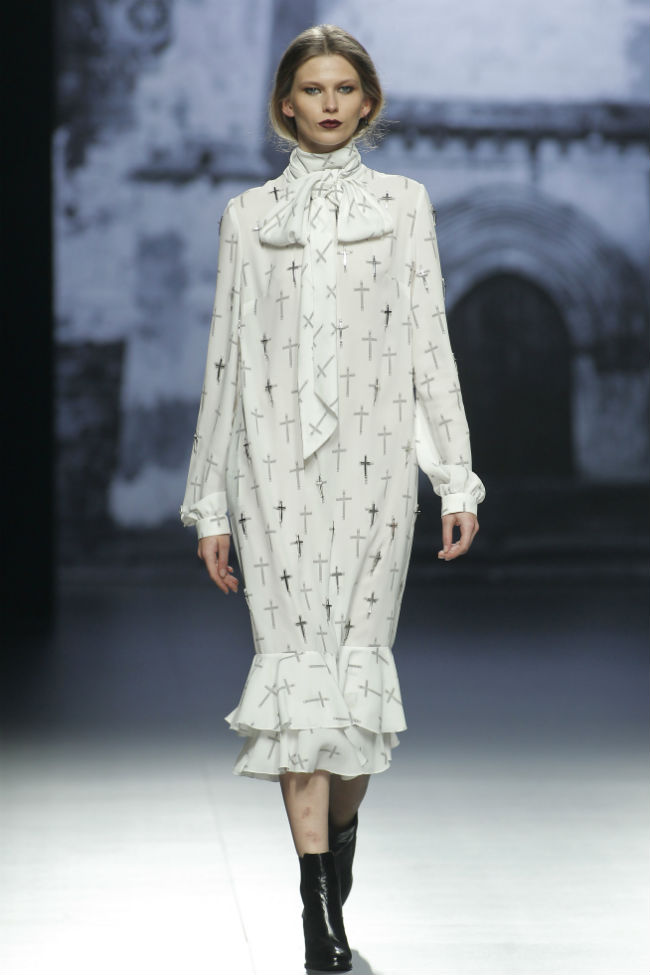 El entorno eclesiástico y esa ‘devoción’ por el luto se han plasmado en las prendas a través de estampados de cruces y vestidos en color negro. Redemption, así es como se llama esta colección otoño invierno 2016/17, toma forma de mujer que refleja sus emociones y quiere sentirse femenina.