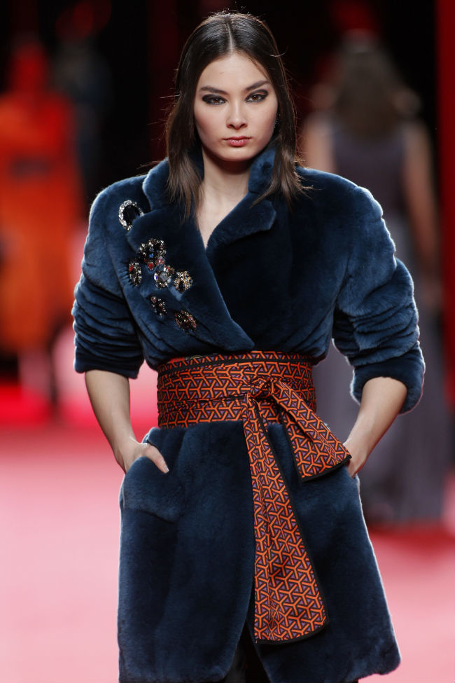 Los chalecos y abrigos de piel muestran la figura femenina gracias a cinturones fajín, una apuesta por marcar las formas de una forma chic y sexy. Además, Juanjo Oliva plasma la estética rusa aderezando los tejidos suaves con originales broches.
