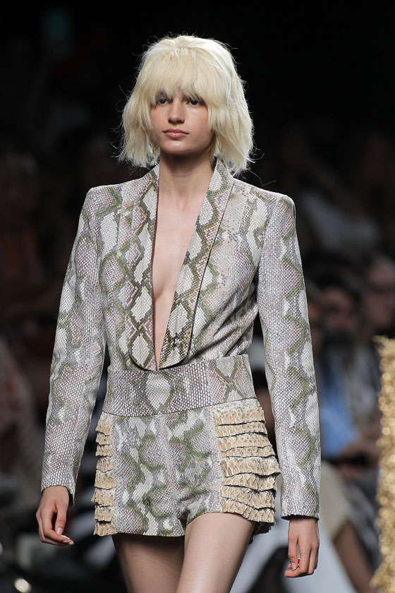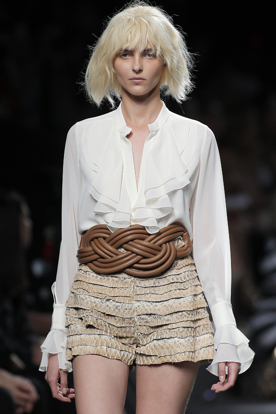 En su jardin particulier de la pasarela, la helbigirl viste tejidos-joya que entroncan con el universo naturalista, botánico y colorido de los parterres. Las cuerdas de algodón enceradas dibujan tipos de anudados. El tul, el glitter, el terciopelo y las puntillas imitan las texturas, tonalidades y formatos infinitos de la flora. Hemos diseñado un print y lo hemos aplicado en cuero. La construcción artesanal de flores mediante técnicas de vidrio soplado de Murano, porcelana, tejido y cera nos permite obtener unas flores frágiles y fuertes a la vez para complementar los looks.
