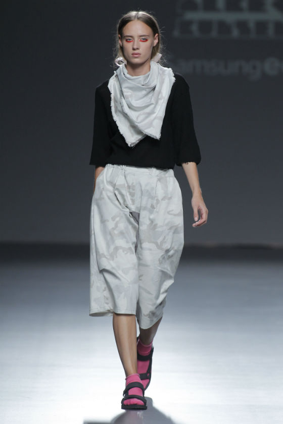 El desfile de Abrahamsson ha dado el pistoletazo de salida a la 6º edición de Samsung Ego Innovation Project con su colección Abra. Diez looks femeninos que han sido elaborados a partir de patrones base en un live fitting. Estas piezas reflejan la relevancia del yo virtual cotra el yo real, en una sociedad absorta en el mundo digital.