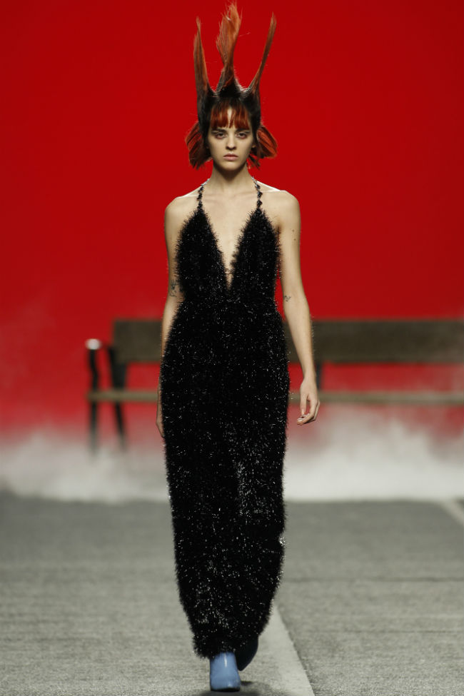 4. Days of Being Wild: Los vestidos de noche los 70’s se elaboran con pelo plástico brillante, raso técnico drapeado o charol fruncido. En cuanto a calzado no faltan los botines de tacón y punta con aberturas en charol-látex y pelo.