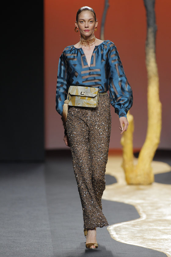 Estilismos unidos por el colorido de los reflejos de la luz en el desierto a lo largo del día, con tonos rojos del ardor del amanecer, oro, perla y tierra, llegando hasta los azules nocturnos, con los brillos en pailletes de las noches estrelladas.