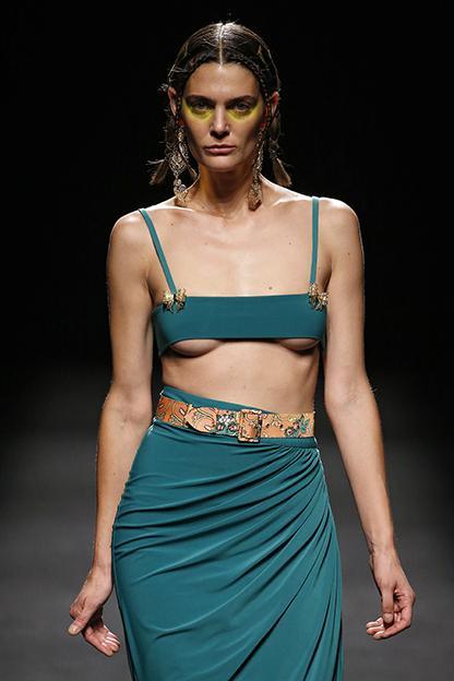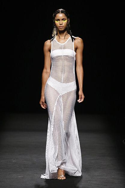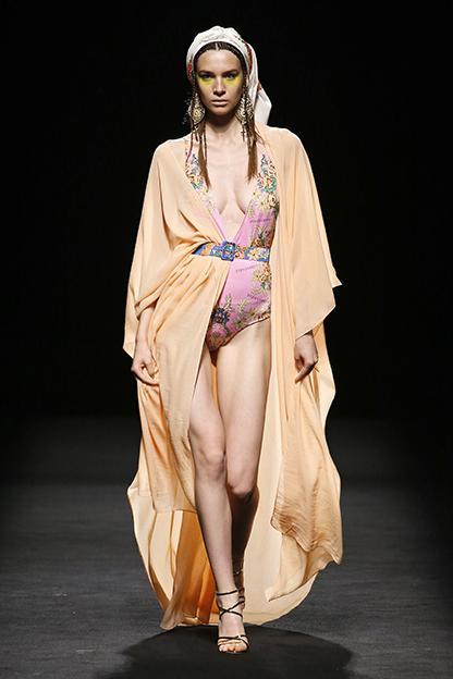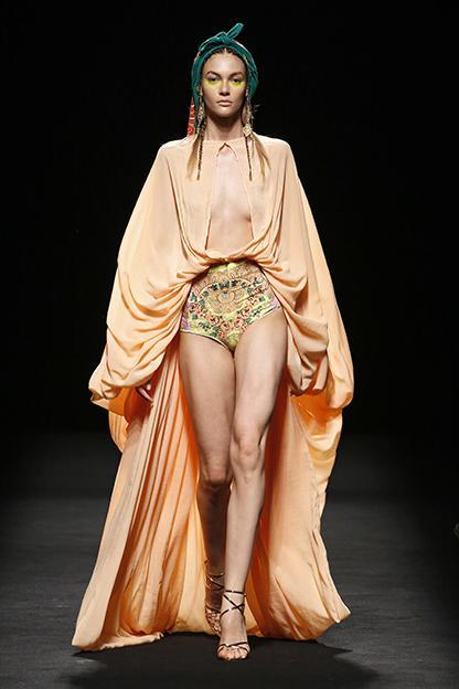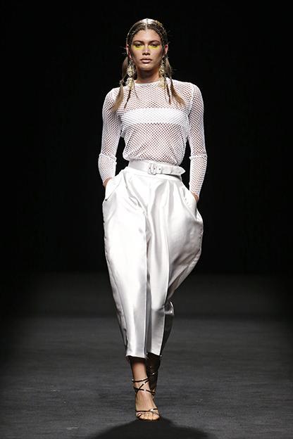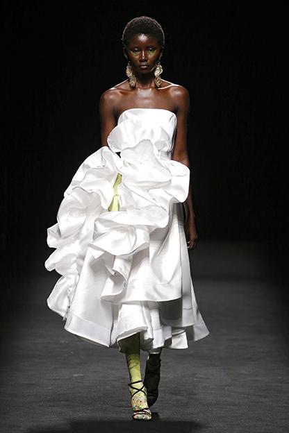 Lo clásicos volúmenes de Roberto pierden peso y ganan en ligereza y adornan vestidos largos que sin duda son sello de identidad de la firma, aunque en esta ocasión el diseñador sustituye el negro por el blanco y los tejidos mates por ricos tejidos en brillo que recuerdan al reflejo de la luz sobre las blancas paredes de Algarve.