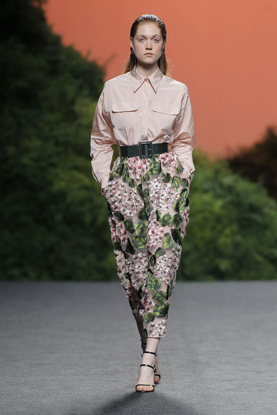 La paleta de colores de esta colección para el próximo año, se ha desarrollado a partir de dos tejidos: el encaje bordado en tonos verdes y nude y el gazar de seda que proponen en tono rosa asalmonado, celeste y crudo con el mismo print floral como base.