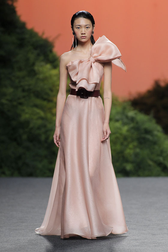 En cuanto los tejidos, destacan los mikados, los paillettes y los paillettes bordadas, tan emblemáticos de la marca, a la que añaden tejidos más ligeros como tulle, gazar y gazar de seda.