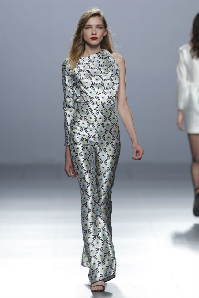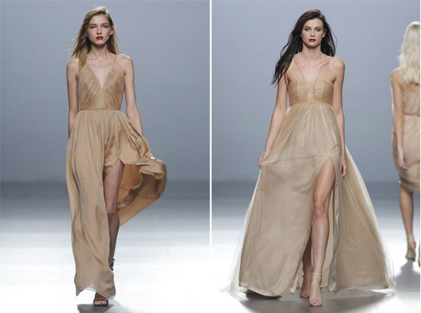 The 2nd Skin Co. se revela aplicando nuevos elementos como el gazar o mikado para diseños mini. Durante la noche los looks vienen cargados de satén, seda o tul, desenvolviéndose con una sinuosa elegancia sobre la silueta femenina. Como colofón, los estilismos han venido acompañados de estolas y detalles de piel de Aurora Maroto. Los zapatos los firma la prestigiosa marca Cuplé.