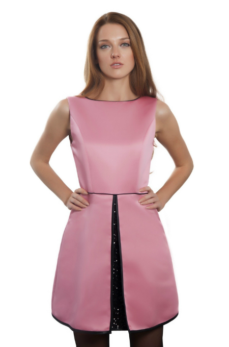 En cuanto a los colores, utiliza tonos muy femeninos y sencillos como los tonos pastel que podemos ver en este vestido rosa ribeteado de negro con doble falda de lentejuelas negras.
