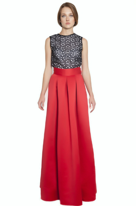 Y no podía faltar el rojo, súper tendencia para esta temporada. La diseñadora utiliza de nuevo vestidos de dos piezas, compuestos por una falda de tablas en raso rojo y top de encaje negro con fondo blanco.