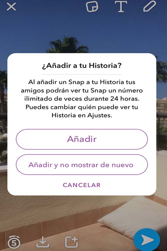 4. Posibilidad de «Añadir» o de «Añadir y no mostrar de nuevo». Mientras que en Instagram no tenemos otra opción que añadir hasta que sea eliminado, en Snapchat encontramos una opción que tan solo permite a nuestra foto o vídeo ser visualizado una vez, como si se tratase se un mensaje de autodestrucción de James Bond.